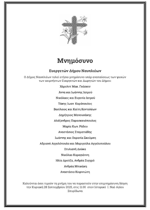 Ο Δήμος Ναυπλιέων τελεί Ετήσιο Μνημόσυνο υπέρ αναπαύσεως των ψυχών των Ευεργετών & Δωρητών του Δήμου, την Κυριακή 28 Σεπτεμβρίου 2025, στις 11.00,