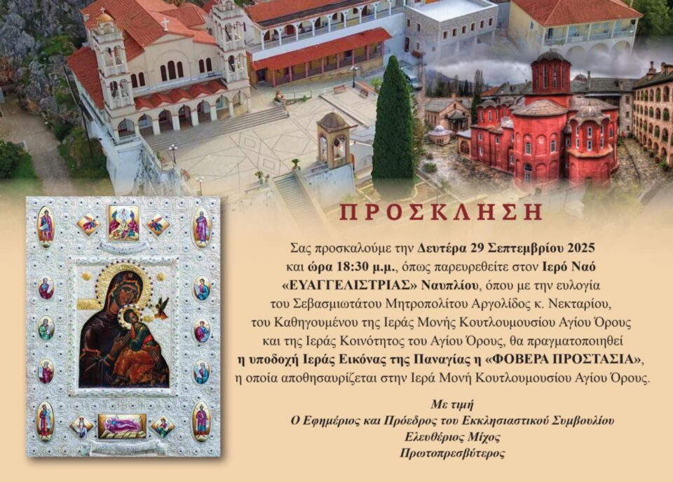 Μεγάλη ευλογία για την Ενορία μας και το Ναύπλιο,αποτελεί η έλευση της Ιεράς Εικόνος της Παναγίας, της «Φοβεράς Προστασίας», από το Άγιον Όρος. Η Παναγία είναι η μητέρα όλων μας, η καταφυγή των θλιβομένων και η ελπίδα των απελπισμένων.
